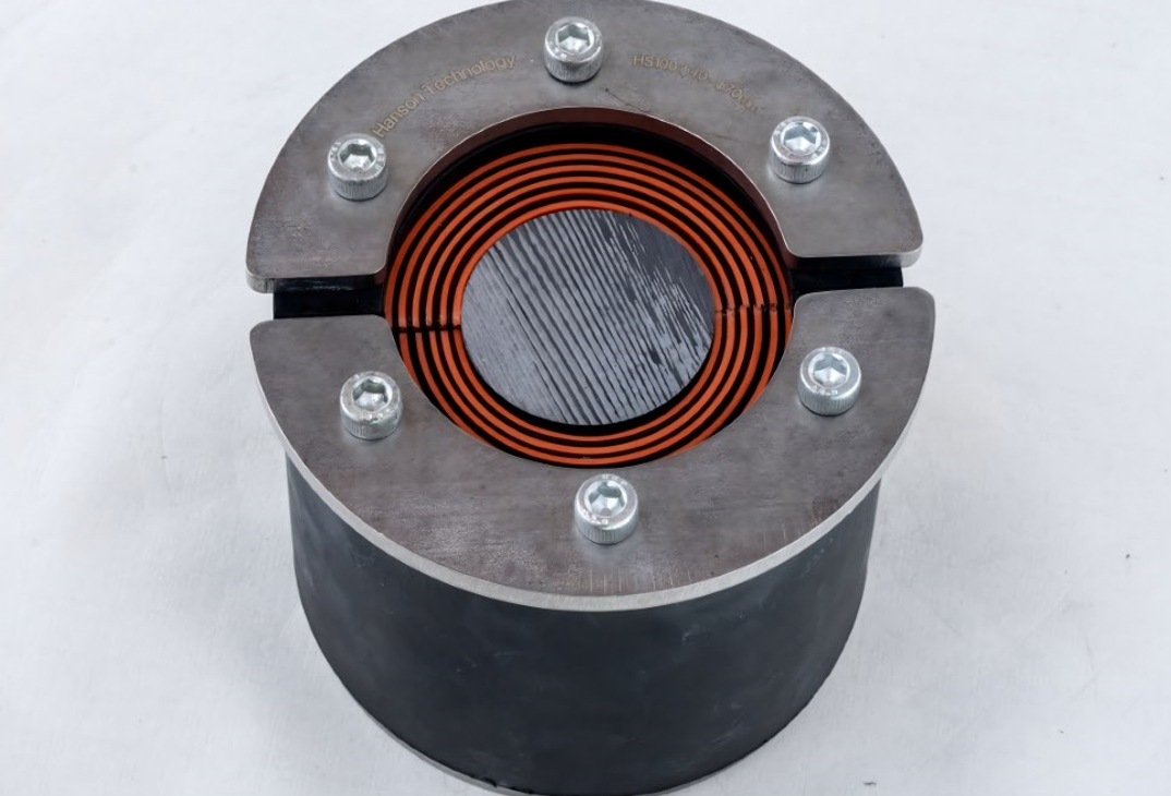 HS系列模块外观为圆柱形,高度80mm,由两个半模块组成,前后预制不锈钢316的金属挡板及螺栓,内部可剥层适配不同规格的电缆外径,中间为黑色实心芯棒